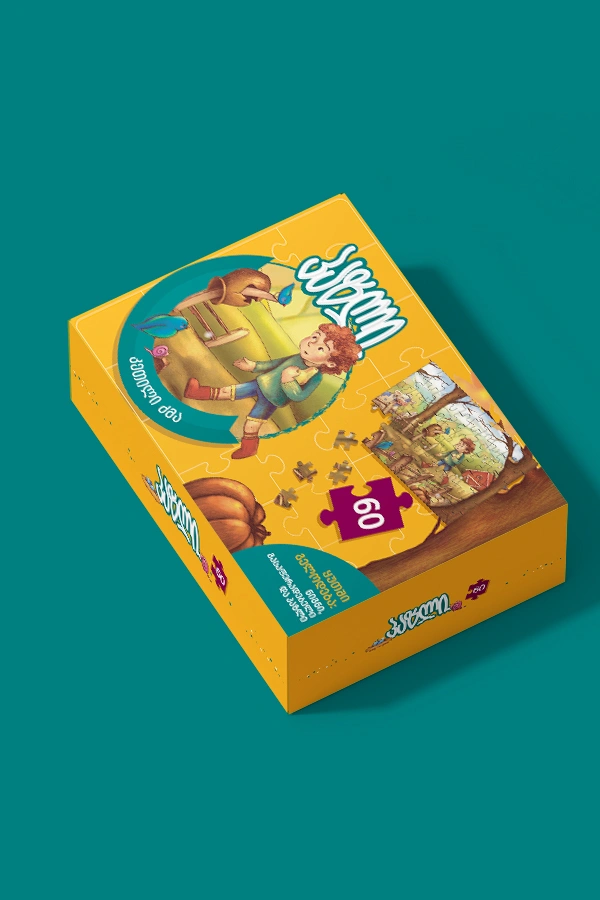 კეთილი ძმის პაზლის ყუთში გელოდება წიგნი, გასაფერადებლები და 60 ნაწილიანი პაზლი.