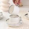 12-ნაწილიანი კერამიკული ყავის ჭიქებისა და თეფშების ნაკრები / თეთრი ვერცხლისფერი რგოლით